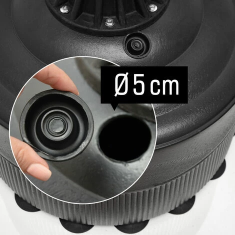 Für eine stabile Basis füllst Du den Standfuß mit Sand oder Wasser. Ist der Fuß mit nassem Sand gefüllt, wird der Boxstand extra schwer und kippsicher.