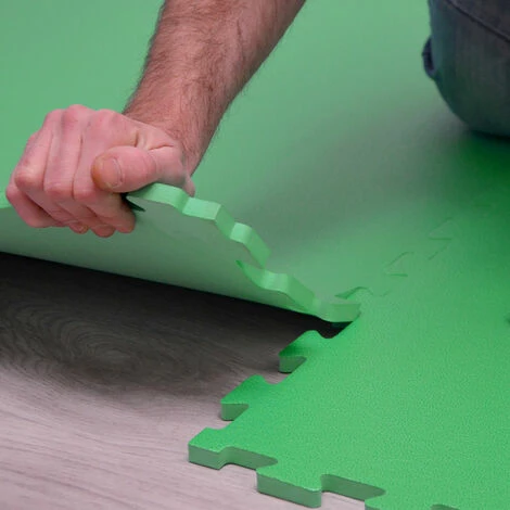 Die riesengroße Schutzmatte dämpft Stöße ab und sorgt für warme Füße. Mit dem Puzzlesystem werden mehrere Bodenmatten sicher verbunden – Matte und Rand lassen sich einfach zuschneiden.