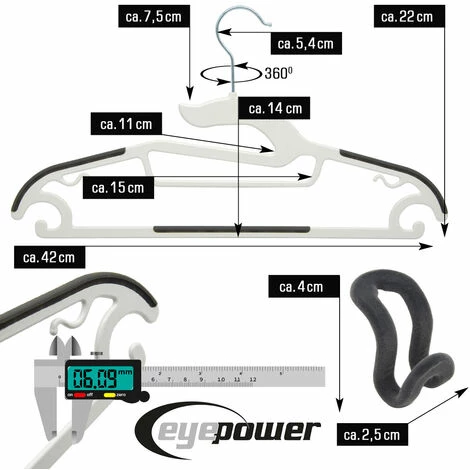 SCHMAL, PLATZSPAREND & RUTSCHFEST – Hochwertige Plastik-Bügel zur Kleider-Aufbewahrung – auch als Wäsche-Bügel für feuchte Kleidung. An den Schlaufen-Haken können Sie Röcke und Tops leicht aufhängen. Plus: Extra-Steg für Krawatten, Tücher & SchalsVOLLE 360 °: MIT DREHBAREM HAKEN – Gummierter Kleiderschrank-Bügel aus ABS-Kunststoff in Weiß, ca. 42x22cm. TPE-Gummierung in Schwarz. Metall-Haken, verchromt, ca. 5,4×7,5cm. Tuch- & Krawattenhalter, ca. 15 cm weit. Bezogene Aufhänger, ca. 4×2,5cm.