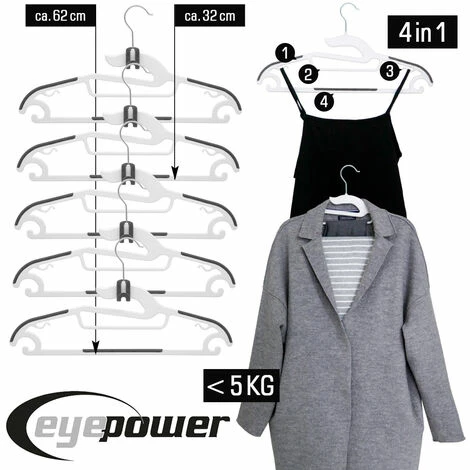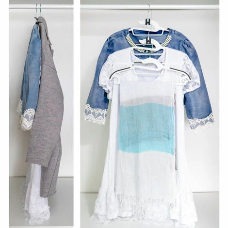 Mit den Kunststoff-Anhängern können Sie Ihre Bügel aneinander befestigen. Jeder Kleiderbügel hat eine Tragkraft von ca. 5 kg. Je nach Schrank-Höhe und Gewicht der Kleidung passen 5 (oder mehr!) Bügel untereinander.
