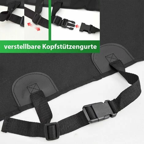 Die Antirutsch-Decke wird wie eine Hängematte mit Klick-Verschlüssen zwischen 4 Kopfstützen angebracht – einfach festzurren, fertig. Polster-Anker und Anschnall-Öffnungen sorgen für Halt und Sicherheit.