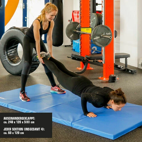Die vier Innen-Platten der Fallschutz-Matte sind aus EPE Schaumstoff, der hochwertige PVC-Bezug ist selbstverständlich schweiß- und speichelfest. Maße (LxBxH) ca. 240x120x5cm, zusammengefaltet ca. 60x120x20 cm. Gewicht ca. 4,5 kg